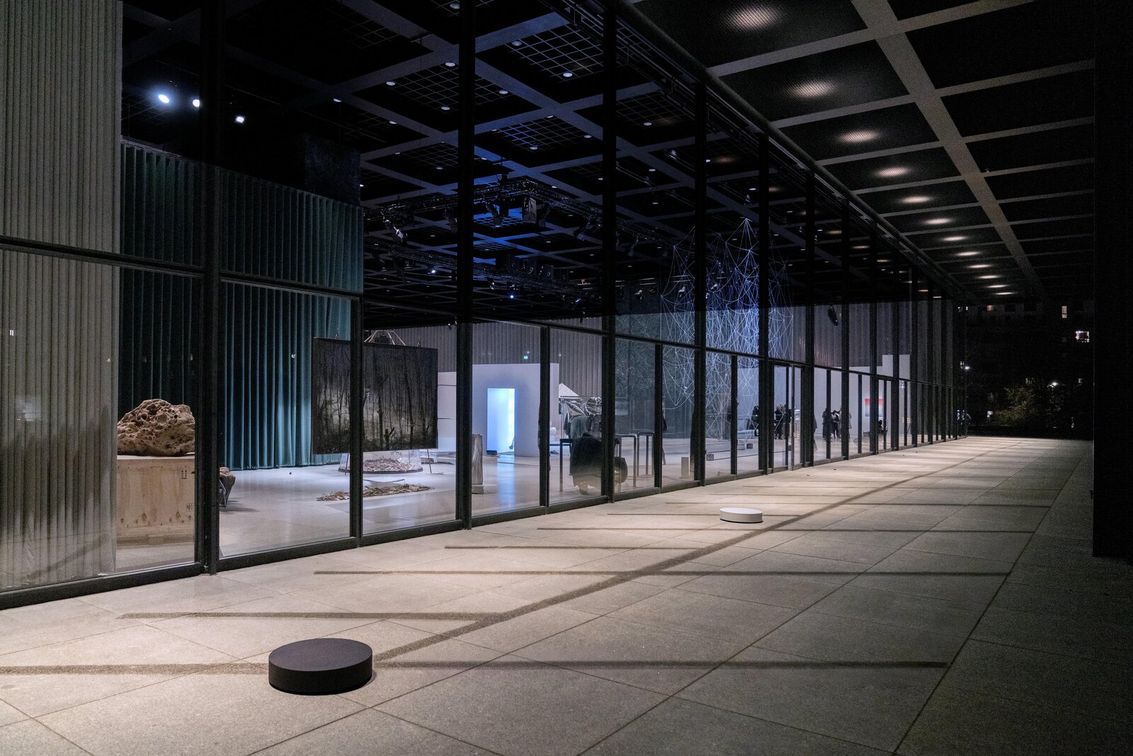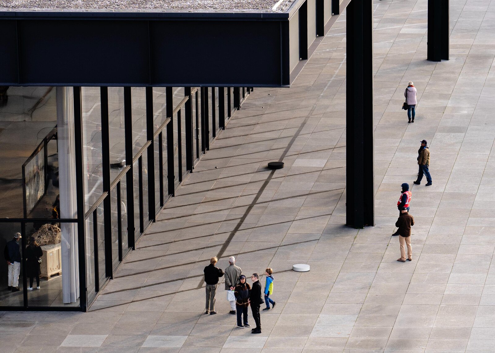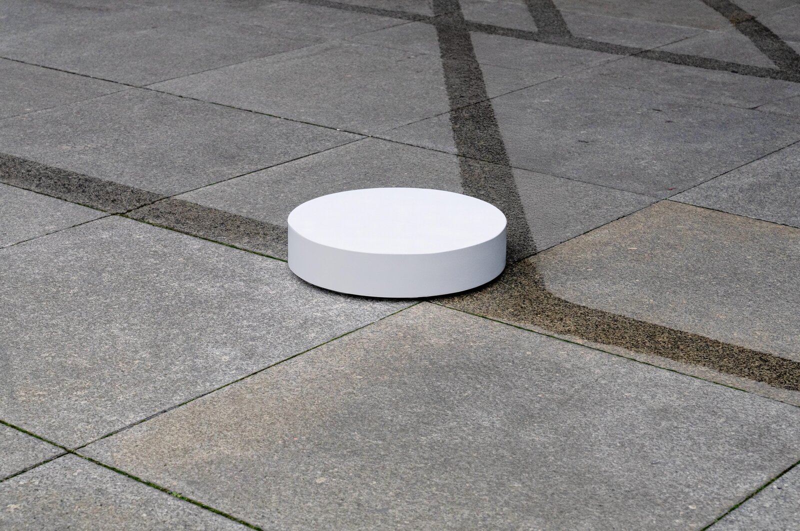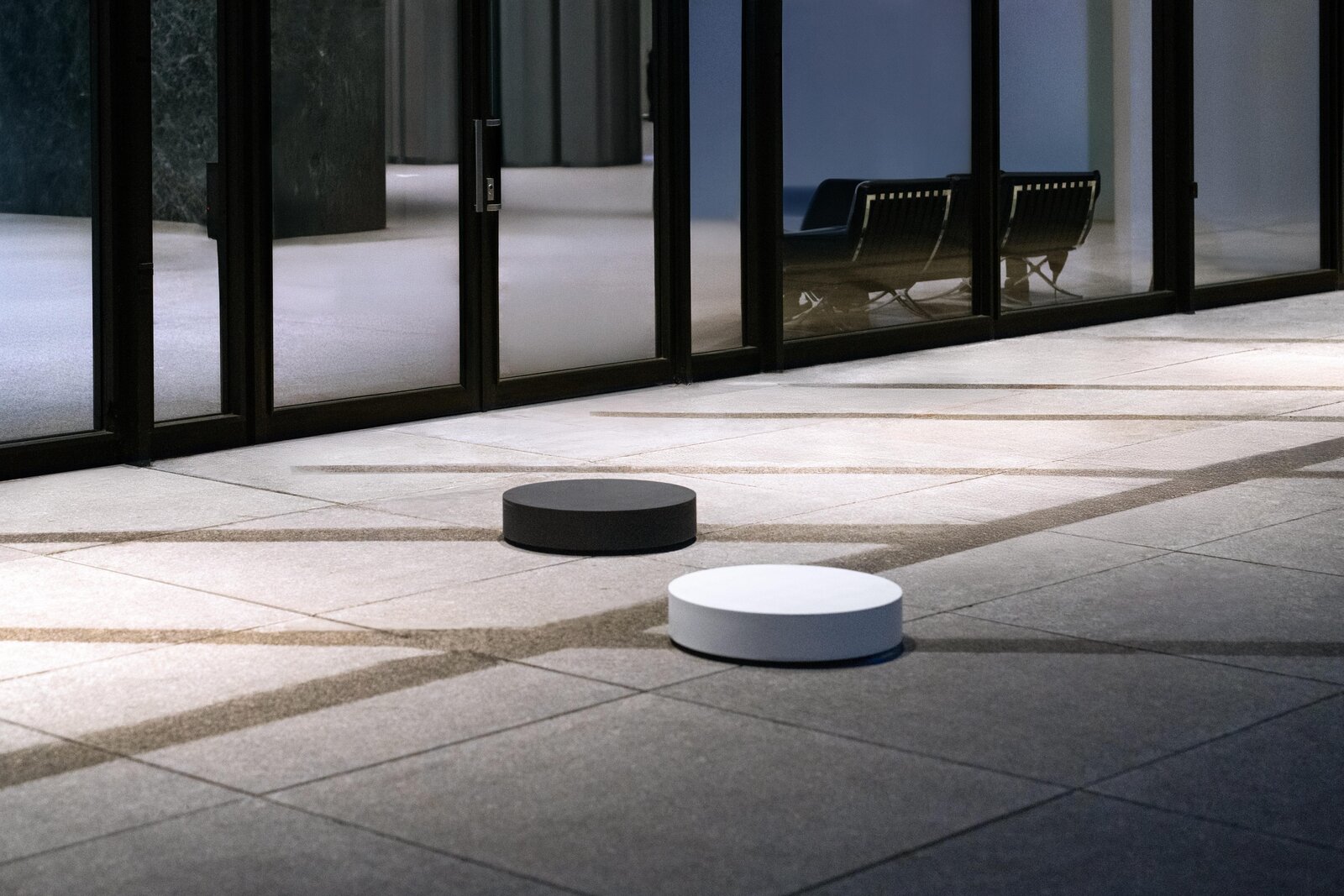 Along the museum’s façade, two autonomous robots hover over the granite grit, like pieces on Mies van der Rohe’s checkerboard, leaving behind sharp, fleeting traces of water. On closer observation, the patterns become methodical, drawing potential shadows from the museum’s window grid, as if cast by an invisible light source. It is a subtle twist on reality, as though a cosmic shift had placed the sun on the other side of the Earth.